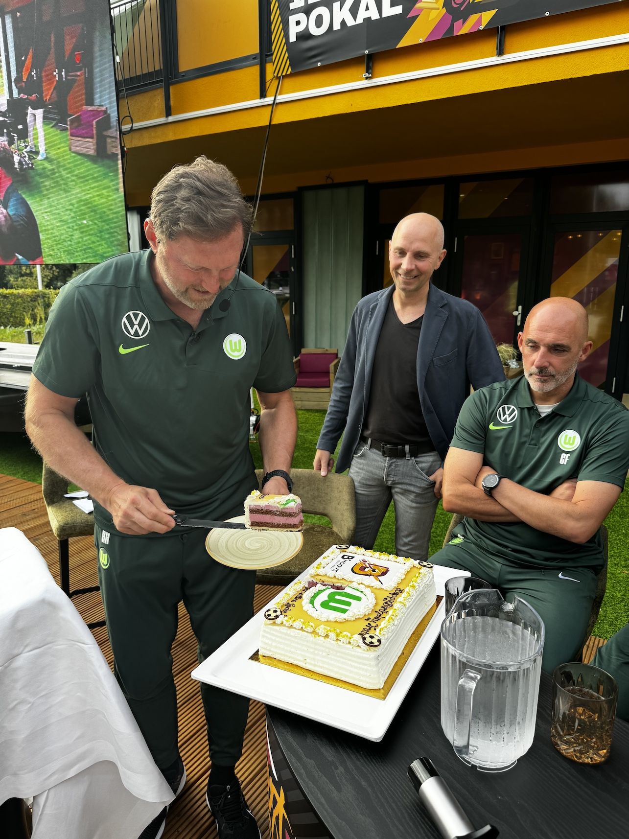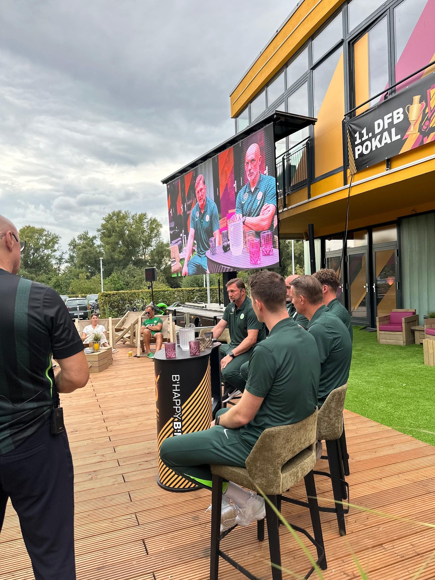 Hoher Besuch für die VfL-Fans in der Wolfsburger Sportsbar B`moovd: Vor dem DFB-Pokalspiel des Fußball-Bundesligisten VfL Wolfsburg am Montagabend in Koblenz war Trainer Ralph Hasenhüttl mit seinem Team zu Besuch. Im interaktiven Fantalk, den Carsten Krystek (Leiter Fanwesen) moderierte, war nahezu das komplette Trainerteam vor Ort. Die Co-Trainer Craig Fleming und Trainer-Sohn Patrick Hasenhüttl, dazu noch Chefanalytiker Martin Raschick und Torwart-Trainer Pascal Formann.